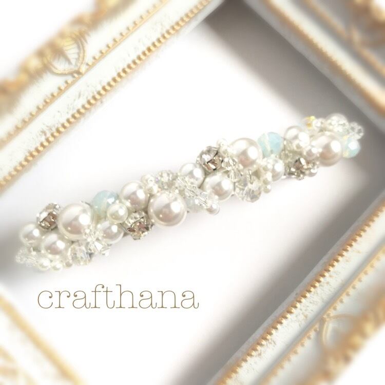 大小のホワイトパールやビジュー、さらにビーズで彩ったバレッタを作りました。