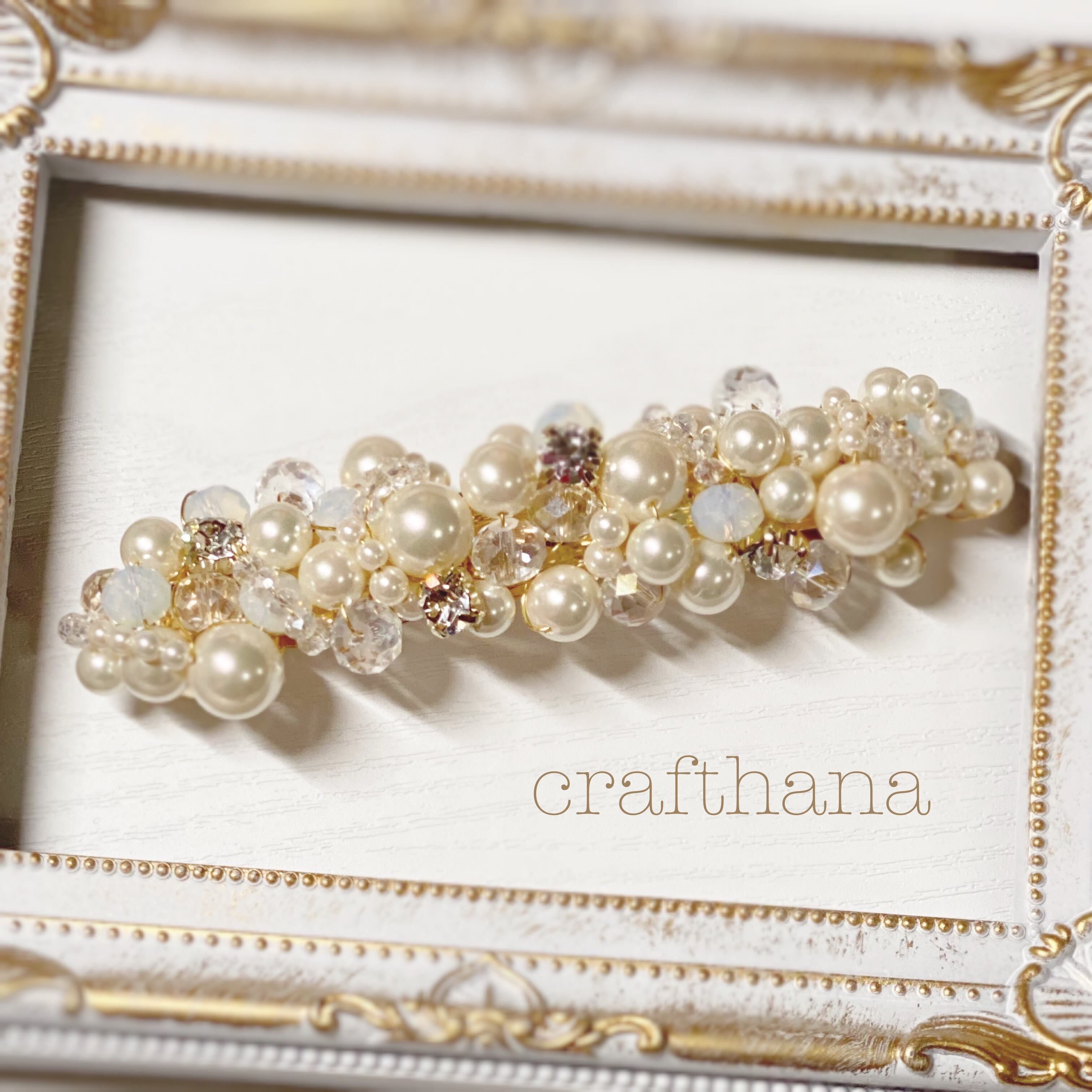 大小のホワイトパールやビジュー、さらにビーズで彩ったバレッタです。